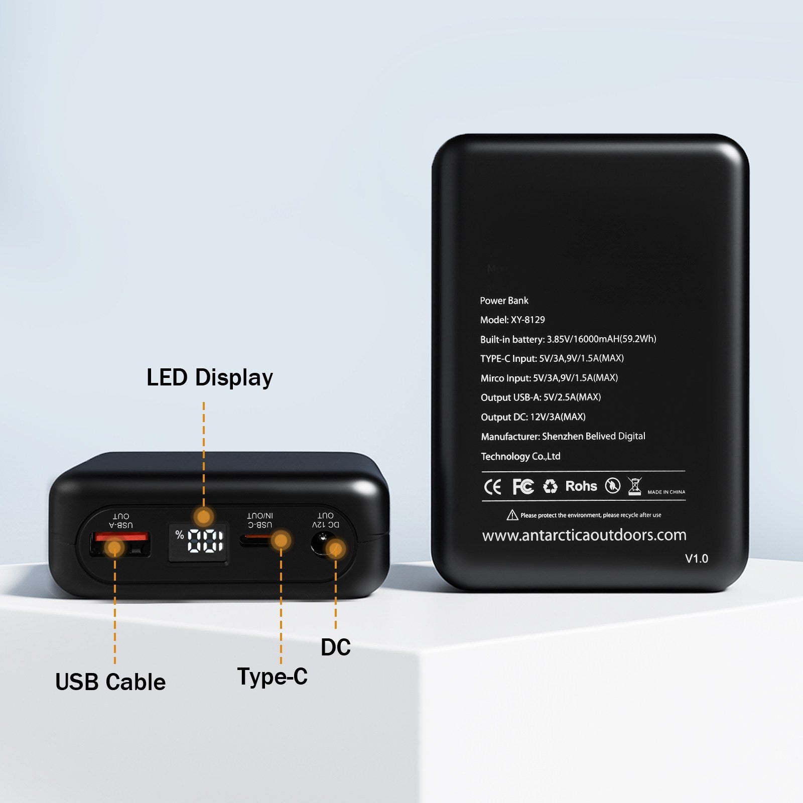 - 12V DC USB-C Portable Charger:ANTARCTICA GEAR Professional charging, not only for our heated jacket but aslo can use for your smart phone and the other smart device. 3.85V/16000mAH(59.2Wh) high capacity and 12V high output voltage.