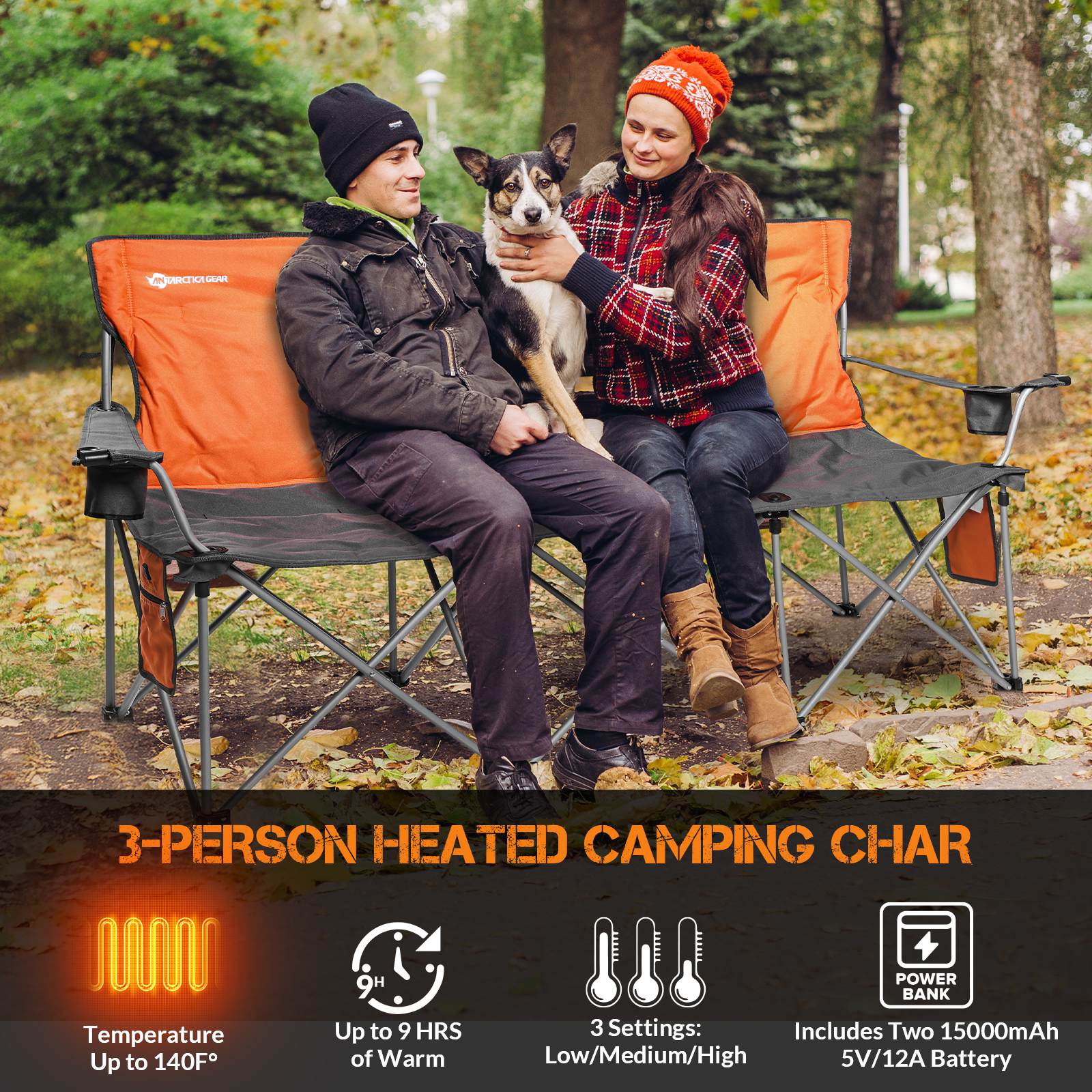 - Ultimate Comfort for Group Adventures: The ANTARCTICA GEAR 3-Person Heated Camping Chair combines plush padding, ergonomic armrests, and a supportive backrest for superior warmth and relaxation outdoors. Dual 15000mAh/12V batteries deliver on-demand heating, ensuring comfort in any weather. Compact folding design includes a waterproof carrying bag for effortless portability.