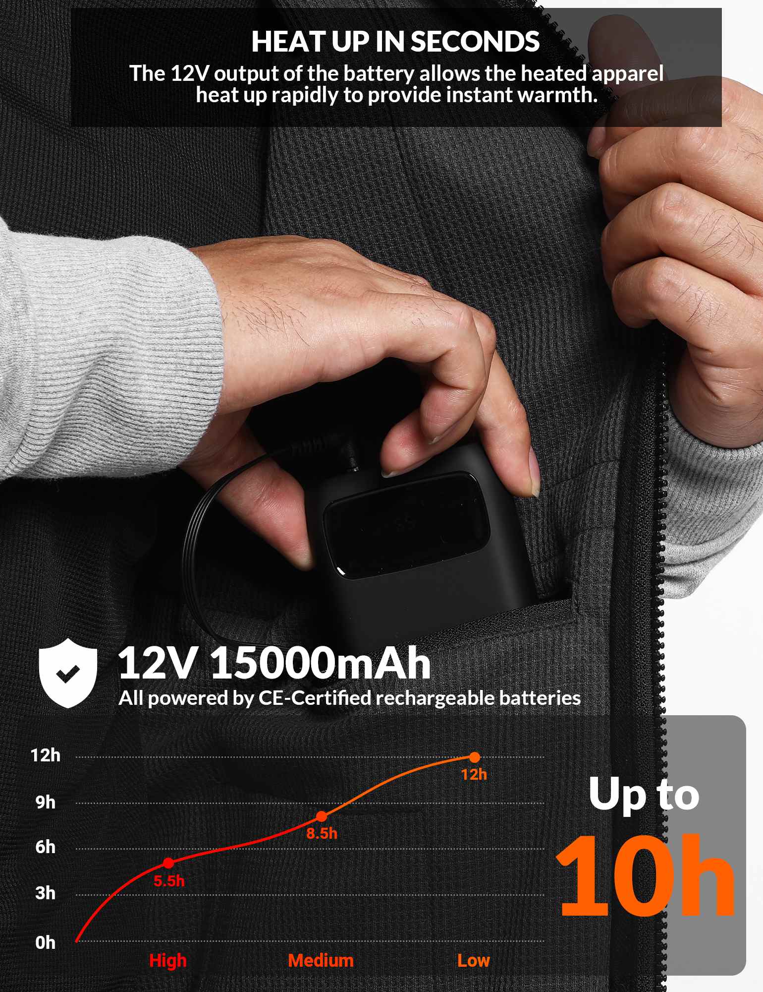 12V Battery Pack with Digital LED Display: The upgraded 20000mAh battery pack, certified by CE, FCC, and UL, is compact and portable. It rapidly heats the hoodie to 140°F within seconds and maintains warmth for 5-12 hours. The digital LED display shows the remaining power, and the USB port allows for convenient charging of smartphones and other devices.