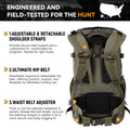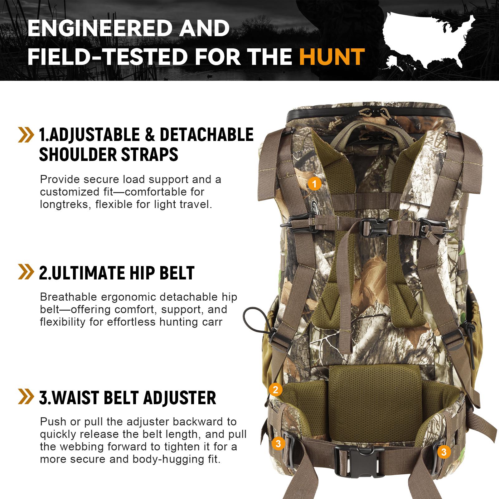 - Comfortable Ergonomic Carry System: Designed with an internal frame sheet and aluminum stay, this hunting bag can be custom-shaped to fit your back. The ergonomic suspension system distributes weight evenly, reducing pressure and improving comfort. Padded, adjustable shoulder straps and a movable waist belt adjustment system keep the hunting backpack stable, making heavy carries easier on long treks.