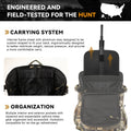 - Cordura Nylon Fabric: This hunting bag is built for the toughest conditions hunters face. Crafted with 500D Cordura nylon, the same material trusted in military backpacks, it delivers exceptional durability, lightweight strength, and reliable resistance to dirt, water, and abrasion. Paired with industry-leading Duraflex hardware, the pack feels lighter to carry without sacrificing toughness, ensuring dependable performance season after season.